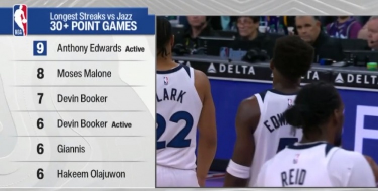 开云体育下载官网-面对爵士连续30+场数榜:爱德华兹9场最多 摩西·马龙第2 布克第3